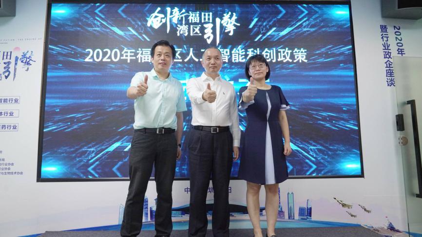 福田区人民政府欧阳绘宇副区长、福田区科技创新局张忠晖局长、人工智能行业协会郎丽艳执行会长联合启动“创新福田,湾区引擎”2020年福田区人工智能科创政策正式发布仪式。