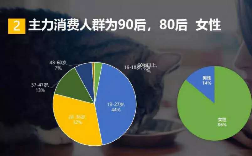阿里巴巴利用线上平台的数据给养宠人群画了一个像,他们的主力军是年轻人,其中80后与90后占比是70%,本科学历占比达到50%,58%是女性。有意思的是从增长的幅度来看,男性养宠的增长速度最快,在过去一年增长了10%。