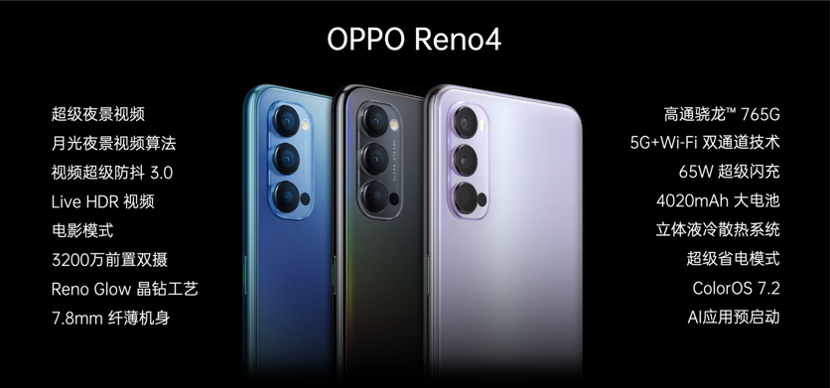 此次发布会上,OPPO还发布了OPPO Reno4,同样搭载高通骁龙™765G5G芯片及65W超级闪充;后置搭载4800万+800万+200万超清激光对焦三摄,前置双摄为3200万+200万组合,同样具备超级夜景视频、视频超级防抖3.0等视频拍摄功能。
