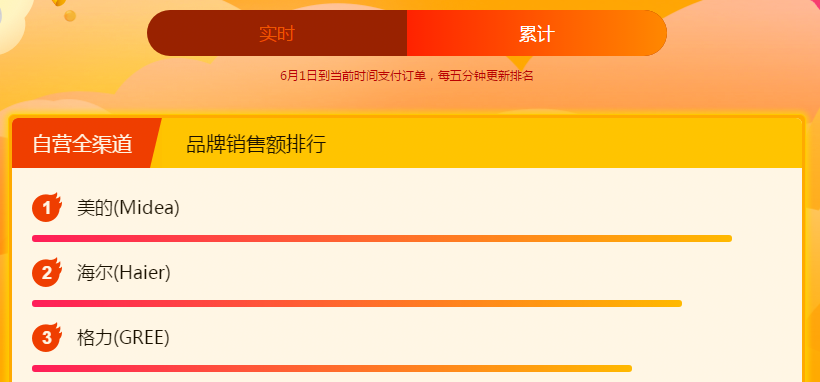 与此同时,头部品牌在苏宁全渠道销售暴增。截至当日16时,美的、海尔、格力占据品牌销售额前三席位。其中,美的以品牌销量、品牌销售额、品牌加购人数三冠的成绩领跑榜单,同时横跨空调、冰洗、品质厨电等多品类品牌TOP榜,成为最大赢家。