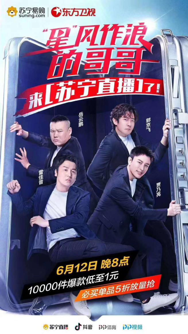 原来,苏宁将在6月12日晚8点开启以“星”风作浪的哥哥为主题的直播活动,共计3个小时。正所谓娱乐购物两不误,极限挑战将阵容搬到了直播间,4位明星搭档主持,带领用户感受全方位的品质化购物,焕新精彩生活。