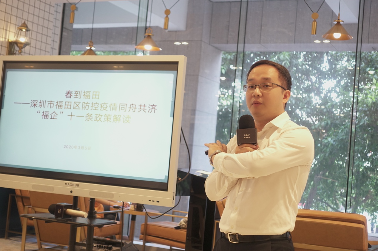 深圳市福田区财政局副局长林俊驹在分享会上指出,作为深圳最早研究提出企业复工复产的政府部门,深圳市福田区财政局第一时间启动了应急资金拨付机制和应急政府采购机制,并快速印发工作指引,加强对各预算单位的业务指导,以及对各单位和各区资金拨付的保障。据不完全统计,在疫情发生以来,深圳市福田区政府共投入4亿多元疫情防控物资购置及医疗救治经费等方面。在此次分享会上,面向入驻在BEEPLUS深圳财富大厦空间的企业会员,林俊驹副局长为与会企业解读了福田区“福企”11条及新“福企”10条政策,强调区政府又另行投入10亿支持福田区企业克疫前行。他表示,在未来,福田区政府将继续为创新创业类企业提供强有力的政策支撑,加大支持力度。