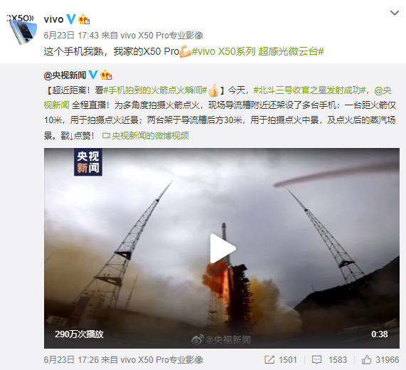见圳客户端 ·深圳新闻网2020年6月28日讯 北斗系统第五十五颗导航卫星暨北斗三号最后一颗全球组网卫星,6月23日9时43分成功发射。为了多角度拍摄火箭点火,央视新闻在导流槽附近架设多台vivo X50 Pro手机,一台位于导流槽旁边,距离火箭10米的位置,用于拍摄点火近景;两台架设在导流槽后方30米的距离,用于拍摄点火中景,以及点火后的蒸汽场景。