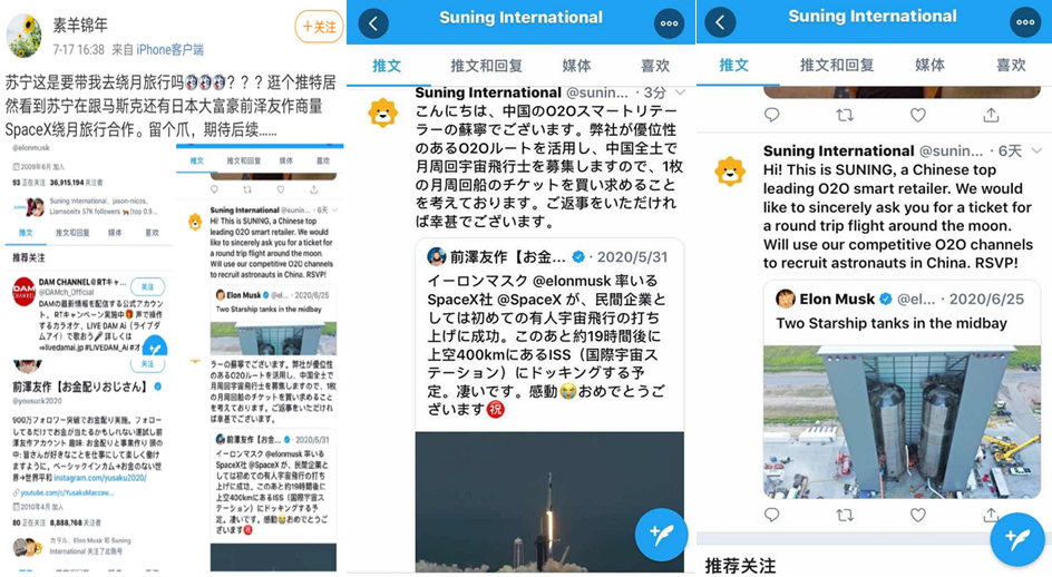 一个马斯克,一个前泽友作,这趟万众瞩目的绕月之旅原本跟我们国内是没什么关系的,但因为苏宁的出现突然有了转机。有微博用户爆料,苏宁7月中时候就在推特向马斯克及前泽友作分别抛出合作求绕月旅行船票的橄榄枝。