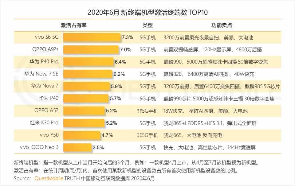 近期发布的《QuestMobile中国移动互联网2020半年大报告》显示,“2020年6月新终端机型激活终端数Top10”的榜单中vivo S系列首款5G手机——vivo S6凭借3200万(像素)前置柔光夜景自拍、美颜(功能)及大电池荣登榜首。值得一提的是,S6的迭代机型vivo S7目前也已经曝光,将于8月3日正式发布。