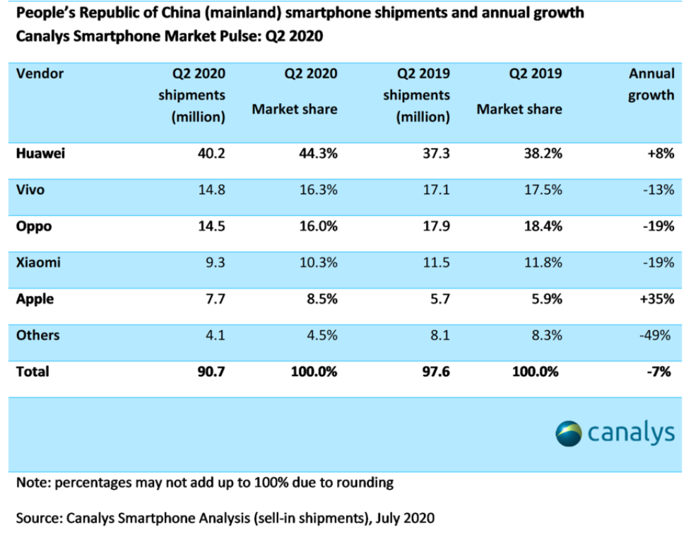 见圳客户端·深圳新闻网2020年8月3日讯 知名调研公司Canalys发布的最新数据显示,尽管与2019年第二季度相比市场萎缩了7%,但中国智能手机市场的季度环比增长了25%,在2020年第二季度达到9000多万台。