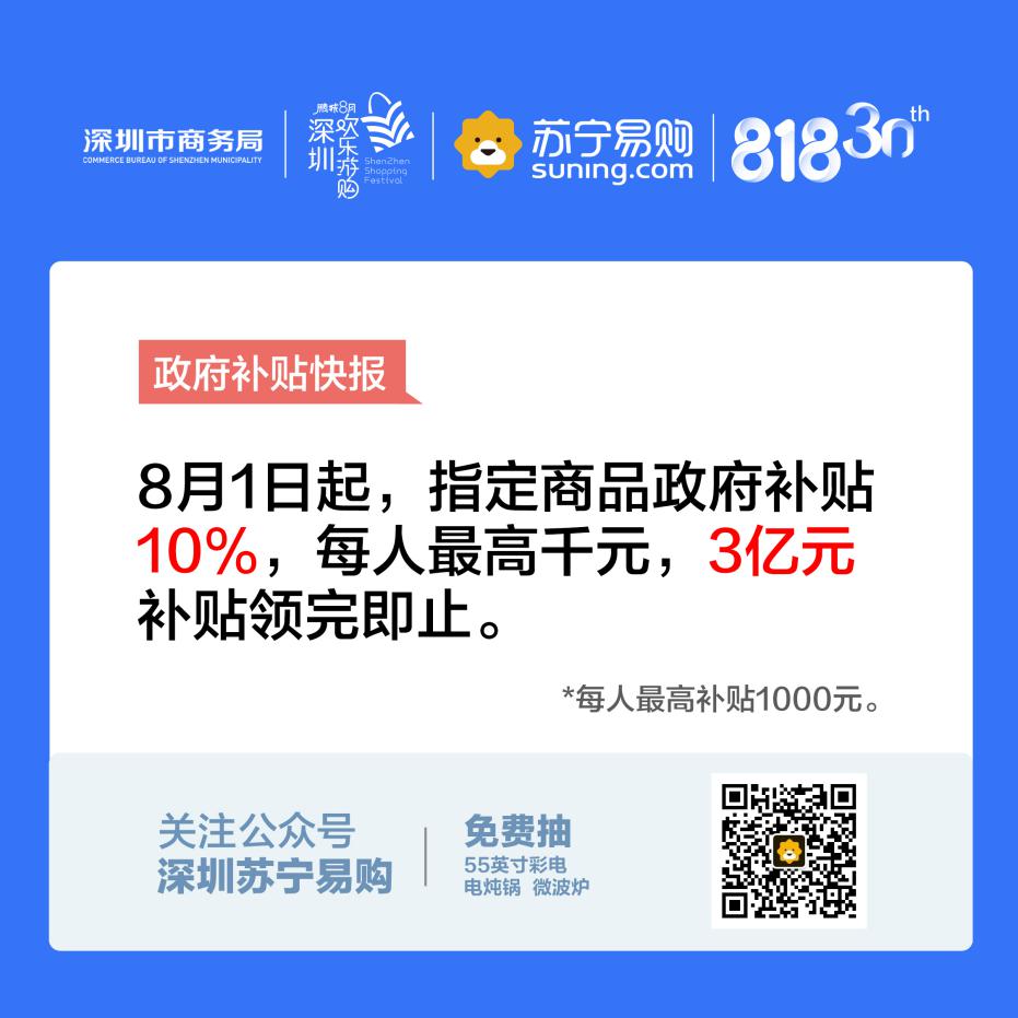 第二届鹏城八月欢乐游购——深圳家电数码消费节在华强北群星广场自8月1日起拉开帷幕,已向深圳居民推出3亿元家电和数码产品补贴政策,用户按实际购买价格的10%给予补贴,每位居民累计最高补贴1000元。粤港苏宁电器店及家乐福与大润发近3000件商品均可享用。品类覆盖齐全,商品选择范围广,为消费者带来一场盛大家电数码消费节的同时为经济消费做出强有力的贡献。
