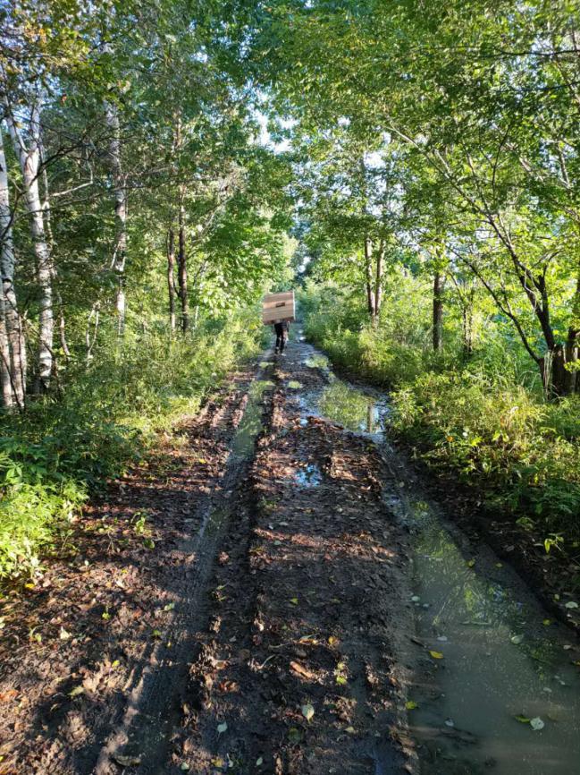 一路开下来,车身溅起不少泥垢。快到目的地时,一段泥泞的林间小路拦住了王能的去路。原来,道路积水过多,泥土过软,车辆不能前行。王能随即将车停靠在路边,直接卷上裤腿,扛起电视前行。两公里的林间路,本就不轻松,扛着电视更是“难上加难”。
