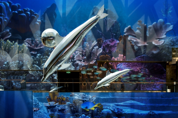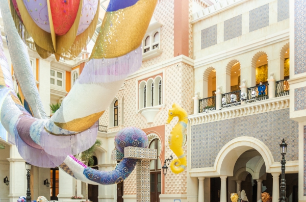 化身为梦幻海洋世界的美高梅,可谓妙不可言,由氦气球制成、以遥控操控的"飞天海洋鱼群"每天下午分4个不同时段现身于澳门美高梅天幕广场及美狮美高梅视博广场,每场表演时长10分钟,适合全家男女老幼共同前来,远离喧嚣尽情观赏。制作团队巧妙地构思,让这些飞天海洋生物完美融入美高梅,与场景交相呼应,视博广场的LED荧幕背景以深海珊瑚为主题,让游客恍惚置身于汪洋大海中那般写意畅泳,来自海洋的独特神秘扑面而来。