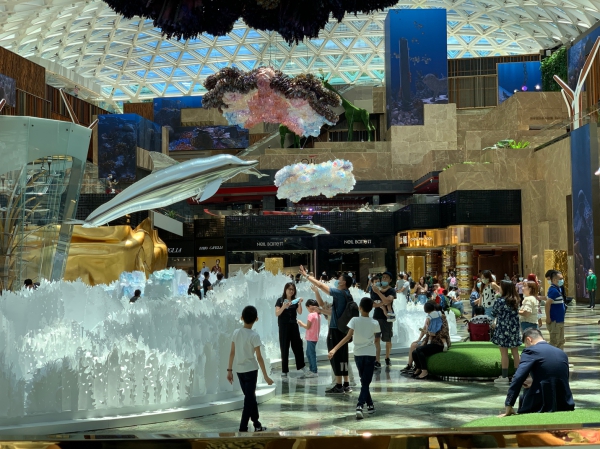 天幕广场的飞天海马与海豚环绕着圆柱形水族馆与珊瑚互动,置身于湛蓝天幕下,栩栩如生的“海洋生物”共同享受蓝色海洋,透过屏幕都感受到一股清凉,绝对是今年夏天不二的亲子时光的热门打卡地。