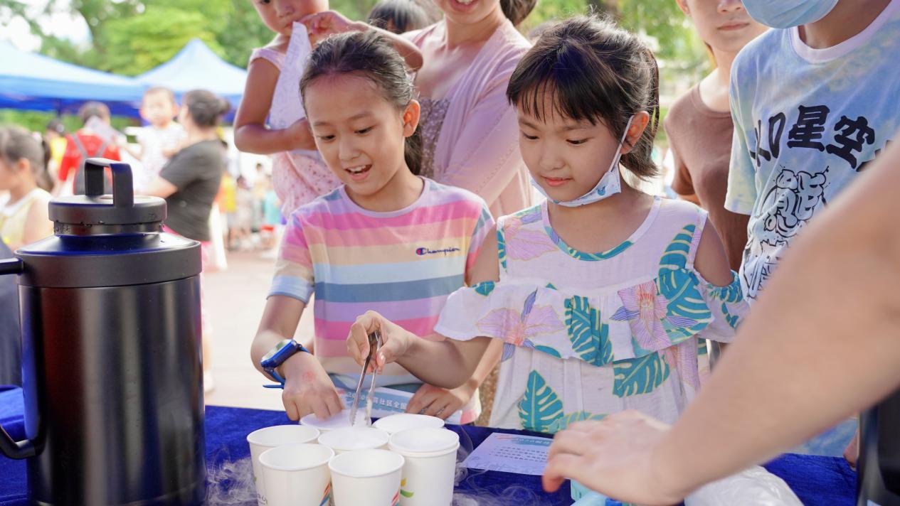 杯子里的干冰剧烈翻滚着,白色的烟雾一团团冒出,辖区居民好奇的看着剧烈升腾的烟雾。“神奇吗?这就是干冰的升华现象”在“科学干冰秀”区域,工作人员边演示边为居民讲解干冰升华原理。