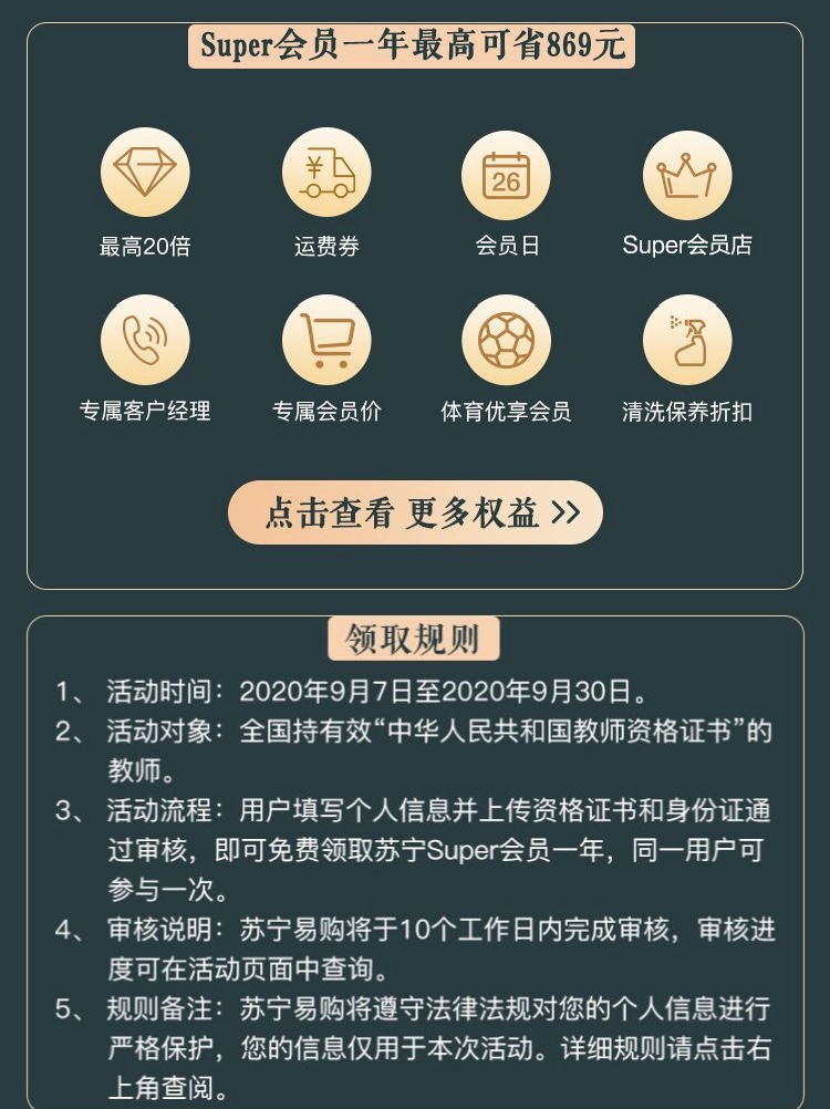 9月7至9月30日,凡持有效“中华人民共和国教师资格证书”的老师,在苏宁易购AP P上搜索“教师”,进入 Super会员领取页面,填写个人信息并上传资格证书和身份证。通过审核后,即可免费领取苏宁Super会员年卡一张。