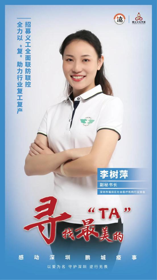 深圳市福田区社会医疗机构行业协会副秘书长李树萍,在区卫生局的帮助下,早在1月16日即率先组织了福田辖区约250家社会办医机构的防疫应急培训,为后续的科学防控打下了扎实基础。疫情关键时期,社区防控一线医务人员力量严重不足,李树萍带领团队联合党委和行业协会发起志愿者招募。历时3个工作日共招募到196名志愿者,培训后符合要求上岗联防联控的123名志愿者,总服务时长达4555小时。
