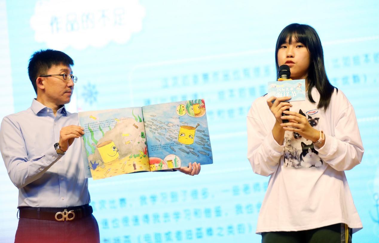 活动现场,来自南山实验二小6年级的由宸睿向现场观众分享创作《鲸鱼岛》的初衷和灵感来源。“虽然人类的环保意识逐渐加强,但是如果只是等待黎明,何不自己冲破黑夜?”由宸睿的作品以鲸鱼为切入点,想象鲸鱼通过复杂的工厂,一道道工序,把垃圾转为灯塔的光亮,为迷失的船只指点方向,呼吁更多人行动起来保卫蓝色星球。