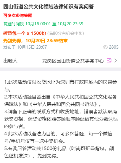见圳客户端·深圳新闻网2020年10月27日讯 (记者 田志强 通讯员 许可)为加强园山街道公共文化服务体系建设,宣传普及 《中华人民共和国公共文化服务保障法》和《中华人民共和国公共图书馆法》 (以下简称“两法”),进一步丰富人民群众精神文化生活,更好地保障人民群众的基本文化权益,推动园山街道公共文化服务高质量发展,促进辖区文化繁荣发展,近日,园山街道组织开展了“两法”文化线上普法宣传系列活动。此次活动通过辖区内各园区及各社区居民小组微信群广泛宣传,覆盖近万名辖区居民。