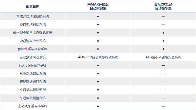 嘉际虽然也有L2级智能辅助驾驶系统,但配置的功能项目远不及宋MAX升级版。嘉际自动豪华型相比宋MAX升级版自动旗舰型贵了5000元,但配置却仅有全速ACC自适应巡航等4项。就主动安全而言,嘉际对全家人的安全呵护不及宋MAX。