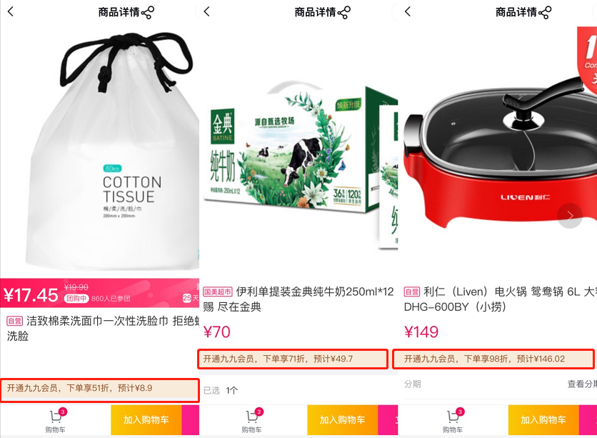 其中,原价19.9元的洁致绵柔洗脸巾只需8.9元即可到手,会员用户在享受会员日常价基础上,叠加享受5.1折;伊利金典纯牛奶原价70元,九九会员可享受7.1折,49.7元就能到手;原价149元的利仁电火锅,九九会员可享受9.8折,到手价146.02元。此外,部分小家电产品还可领取满500减50、满800减80等满减优惠券,享受折上折。