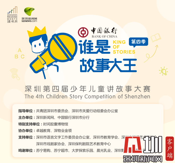 “谁是故事大王·第四季”活动由共青团深圳市委员会、深圳市关爱行动组委会办公室指导,深圳新闻网、中国银行深圳市分行联合主办,卓越教育、深物业金领协办,活动还得到了时间胶囊博物馆、大梦探索乐园的特别支持。