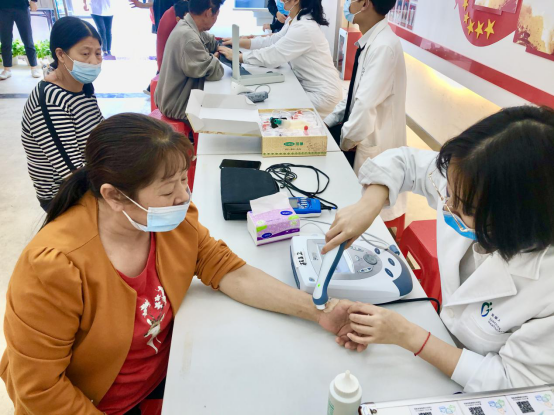 活动现场,社区居民闻讯而至,向医务工作人员咨询各种保健知识和健康问题,通过测量血压、中医学全息四诊(望、闻、问、切)等形式。