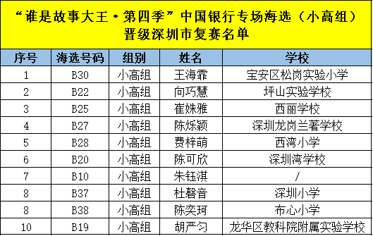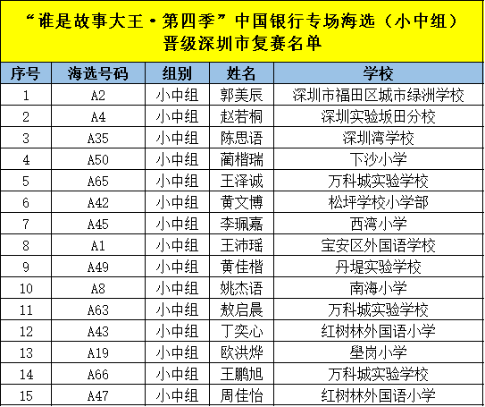 见圳客户端·深圳新闻网2020年11月16日讯 (记者 陈彬 曹园芳 潘宝仪)让阅读成为动人的风景,让故事的魅力感动深圳!11月14日,“中国银行-谁是故事大王·第四季”中行专场海选在深圳商报社大厦成功举行,来自深圳市各区学校的100余名学生参加了比赛。经过激烈角逐,小中组深圳市福田区城市绿洲学校郭美辰等15名选手,小高组宝安区松岗实验小学王海霏等10名选手,分别晋级“谁是故事大王·第四季”深圳市复赛,他们将和来自指定校园分赛区、特约专场以及深圳新闻网线上赛区的选手一起争夺深圳市决赛名额。