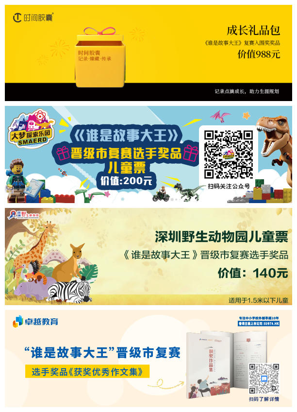 据了解,“谁是故事大王·第四季”分为小中组(3-4年级)和小高组(5-6年级),入围深圳市复赛的学生,即可将获得由时间胶囊、大梦探索乐园、卓越教育、深圳野生动物园等提供的丰厚大礼。“谁是故事大王·第四季”深圳市复赛将于2020年12月12日、12月13日举行,具体比赛时间地点,组委会将以短信和电话的形式通知复赛入围学生。