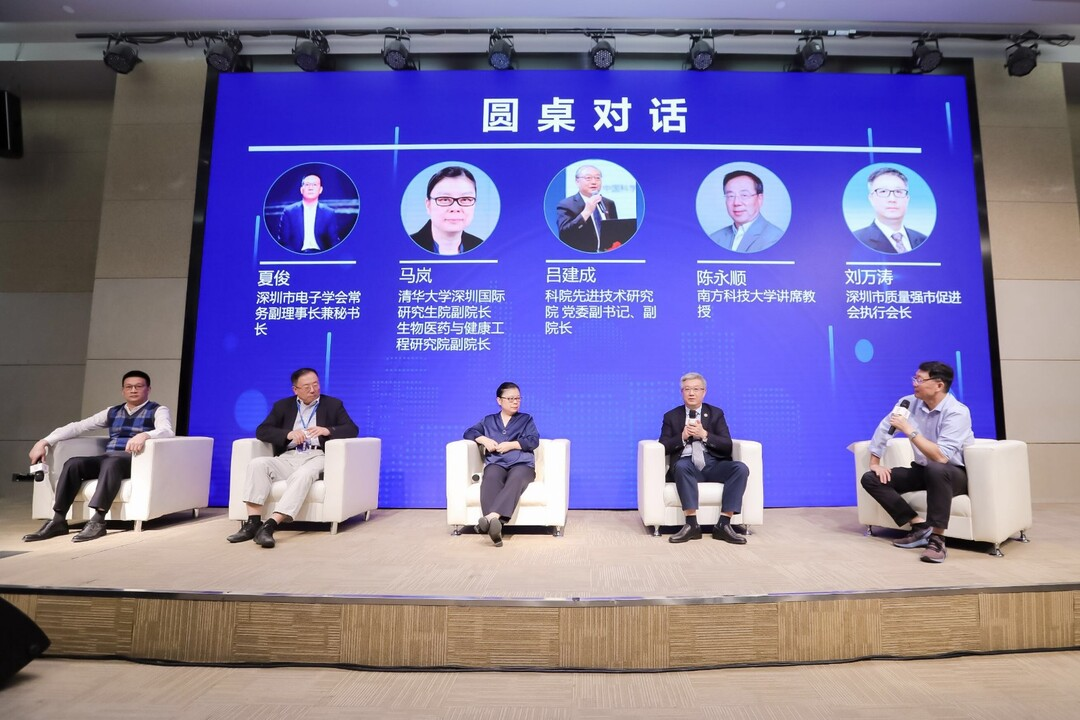 在圆桌对话环节,深圳市电子学会常务副理事长兼秘书长夏俊、深圳市质量强市促进会执行会长刘万涛等嘉宾以“学科发展、科技进步、人才成长和科学普及等方面的作用”为主题展开交流与讨论。
