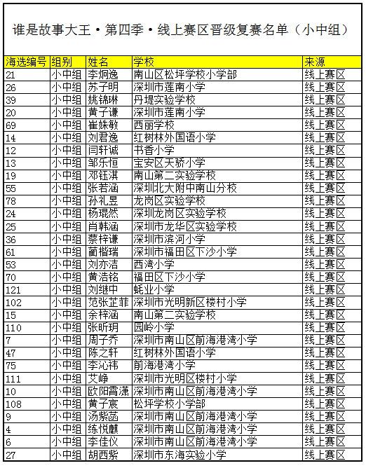 见圳客户端、深圳新闻网2020年12月3日讯 (记者 潘宝仪 陈彬)12月3日,“谁是故事大王·第四季”线上赛区晋级深圳市复赛的名单出炉,最终,小中组李炯逸、苏子明、姚锦琳等31人,小高组罗羚丹、钟欣妍、李炫璋等20人,从线上赛区数百人中脱颖而出,晋级深圳市复赛。自此,“谁是故事大王·第四季”的海选全部结束,从“校园赛区”、“线上分赛区”、“特约专场”等赛区晋级的200位学生成功进入深圳市复赛,深圳市复赛将于12月12日(小中组)、12月13日(小高组)进行。