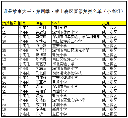 附:“谁是故事大王·第三季”-线上赛区晋级深圳市复赛名单