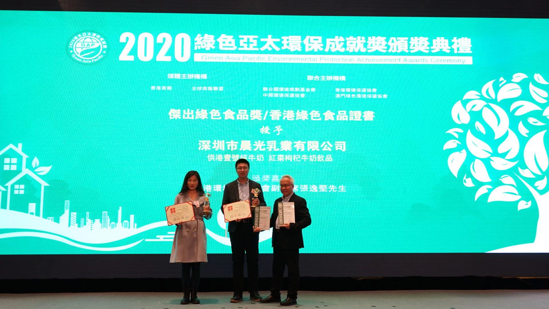 颁奖典礼上,“2020绿色亚太环保成就奖”之“杰出绿色环保先行示范区奖”授予深圳市大鹏新区;“杰出环境保护企业奖”有两家得主,分别授予河南平煤神马环保节能有限公司、惠州市深广田产业投资发展有限公司;“杰出再生能源生产企业奖”授予广东亨业环保科技有限公司;“杰出可持续发展工业园区”授予中国四角楼国际珠宝创意产业园;“杰出环保进步奖”授予深圳市粤环科检测技术有限公司研发的土壤环境监测系统;“杰出健康保健产业贡献奖”授予深圳腾云健康服务有限公司;“绿色亚太2019环保成就奖”之“杰出环保终身成就奖”分别授予孙毅先生、郑行祥先生;“杰出环保领军人物奖”授予白鹏先生;“绿色亚太2019环保成就奖”之“杰出绿色食品奖”,获奖产品有3种:通过香港国际检测中心检测并获颁香港(国际标准)食品安全证书的深圳市晨光乳业有限公司的供港壹号纯牛奶、红枣枸杞牛奶饮品,以及上帝之草康养产品有限公司的上帝之草康养产品系列;该产品系列还获得“杰出绿色健康创新产品奖”;“绿色亚太2019环保成就奖”之“杰出绿色低碳产品奖”授予河南平煤神马环保节能有限公司研发的发泡陶瓷产品;“杰出健康保健产品奖”授予深圳腾云健康服务有限公司所产的希丽量子冷凝胶;香港特区政府商务及经济发展局副局长陈百里博士,在颁奖典礼上的视频连线致辞中衷心祝贺得奖者。