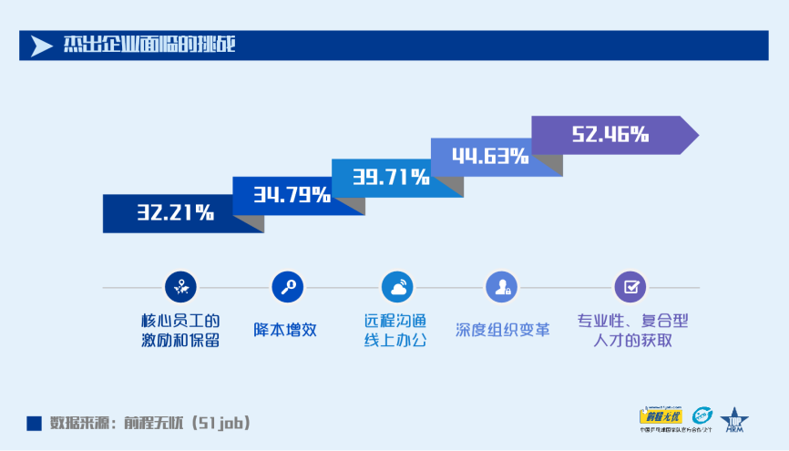 2020年杰出企业招聘员工总数较2019年增长了4.21%;55.48%的企业预计人均招聘成本呈增长趋势,在此前提下,依然有56.04%的企业预计会在2021年扩大招聘来获取人才优势。894家获奖企业中,有469家将“为筹备未来招募新团队,加大专业性人才和复合型人才的获取“列为本年度企业人力资源管理所面临的最大的挑战。
