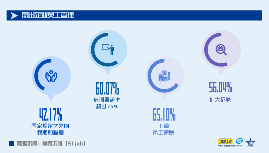 员工培训方面,6成杰出企业员工培训覆盖比率超过75%,杰出企业的人均年培训时长达到15.17小时,年人均培训预算为1841元。薪酬方面,65.10%的杰出雇主上调了员工薪酬,平均增幅为8.31%;34.34%的企业员工收入与去年持平。