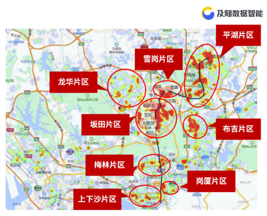 从热力图中可以看出,10号线客流集中居住在三大片区:平湖、雪岗、坂田,深圳地铁10号线的开通,结束了三大片区内多数区域不通地铁的历史,这三个大片区的居民成为了10号线的主力乘客。