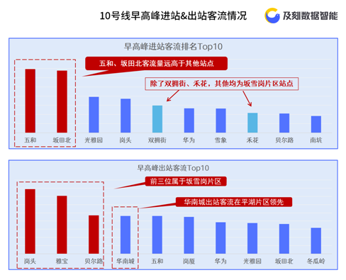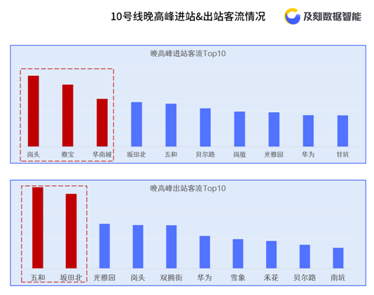 早高峰(6-10点)进站客流Top10站点中,坂雪岗片区占据8席,反映其周边区域聚居着众多的上班族。其中,五和、坂田北进站客流遥遥领先其他站点。