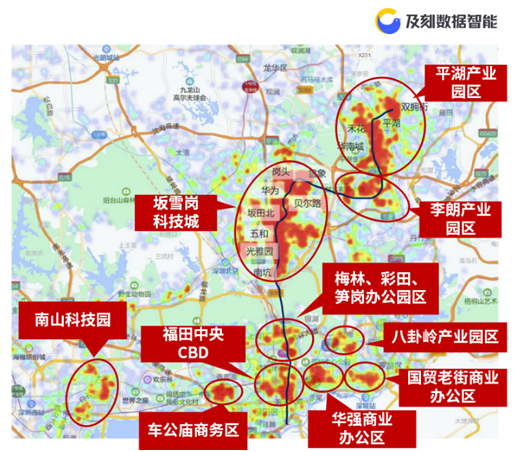 从热力图中可以看出,10号线乘客工作地主要集中在关外的三大片区,分别是坂雪岗科技城、平湖产业园区、李朗产业园区。