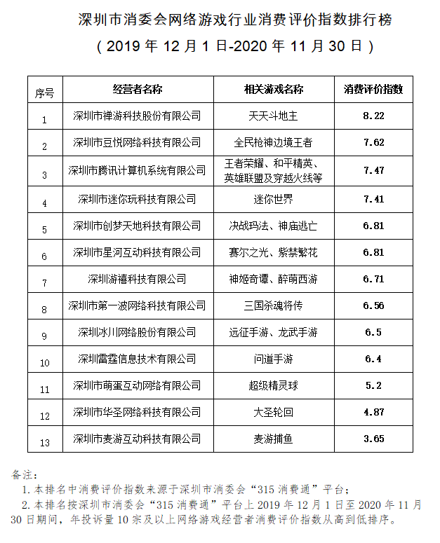 为推进网络游戏消费者权益保护工作,促进网络游戏行业规范发展,引导放心消费,深圳市消委会依据2019年12月1日至2020年11月30日期间的相关数据,对注册所在地为深圳的年投诉量10宗及以上的13家网络游戏经营者进行消费评价指数排名。