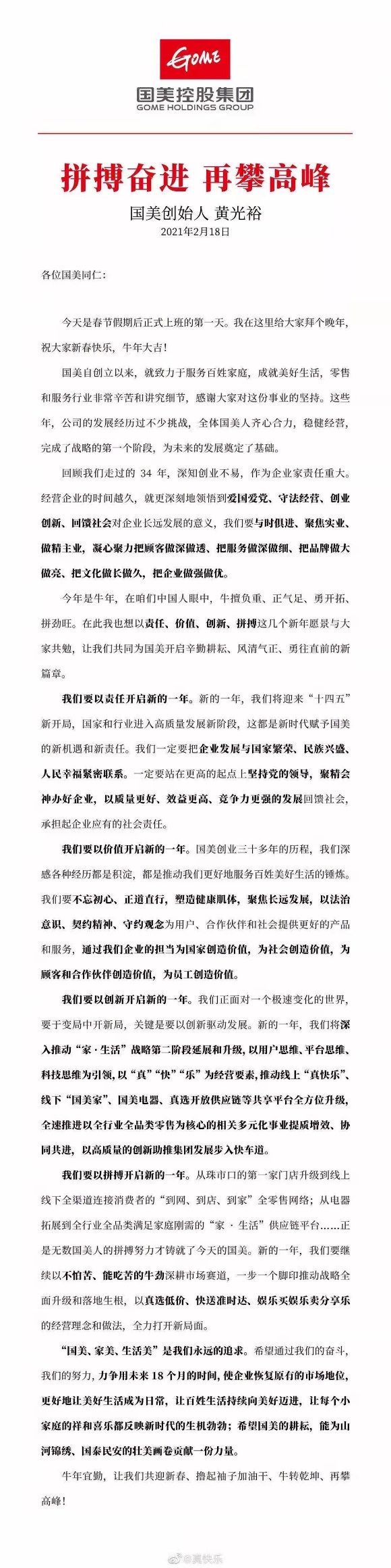 见圳客户端·深圳新闻网2020年2月24日讯 近日,国美控股集团官方微信号刊发了一篇黄光裕在高管会上题为《拼搏奋进再攀高峰》的讲话。文中提到新的一年,国美要继续以不怕苦、能吃苦的“牛劲”深耕市场,一步一个脚印推动战略全面升级和落地生根,以真选低价、快送准时达、娱乐买娱乐卖分享乐的经营理念和做法,全力打开新局面。