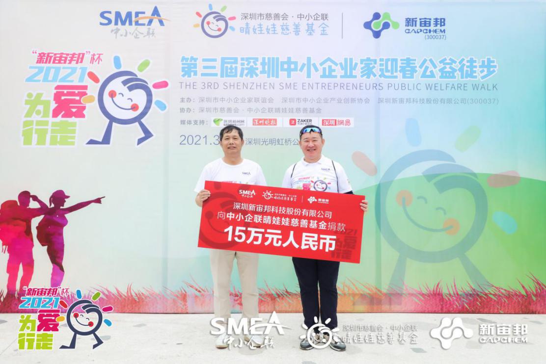 第三届“为爱行走”活动的爱心冠名企业-中小企联副会长、深圳新宙邦科技股份有限公司董事长覃九三向中小企联晴娃娃慈善基金捐款15万元人民币。