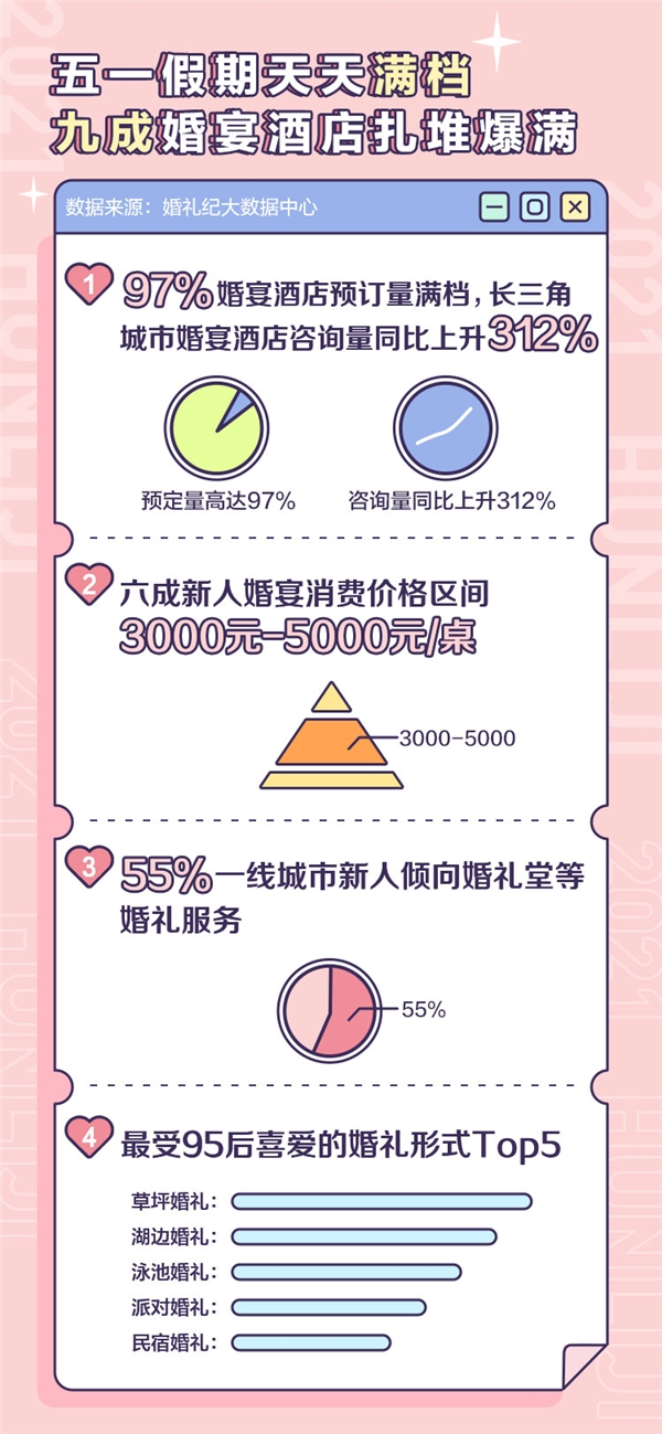 婚礼纪五一结婚数据显示,五一假期,酒店婚宴预订火爆,97%婚宴酒店预订量满档。以上海为中心的长三角城市婚宴酒店咨询量同比上升312%。上海的婚宴消费显得有点壕,价格集中在6000元-8000元/桌,超过了全国六成新人婚宴消费心动价格区间3000元-5000元/桌。