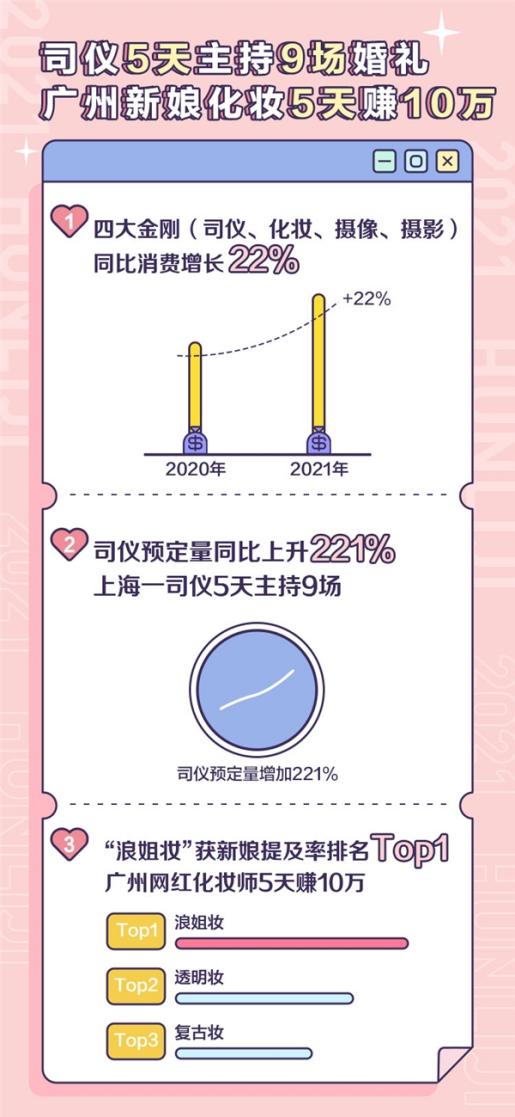 “快要忙疯了,五一5天办了150多场婚礼,第一天就有60场,去年这时候婚礼只有个位数,今年我们员工都加班加点连夜赶工搭建场地。”婚礼纪商家Sunny喜铺婚礼副总赵佳佳在接受采访的时候表示,不仅商家忙,新人也非常忙,Z世代的新人都习惯于通过线上咨询、直播下单等互联网形式进行婚礼消费,省去了线下奔波的时间。