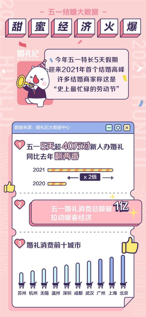 数据显示,五一迎来2021年首个结婚高峰,5天内超40万对新人举办婚礼,同比去年翻两番。五一婚礼消费总额破1亿,在一定程度上拉动暖春经济。婚礼消费前十城市分别是北京、上海、广州、武汉、成都、深圳、温州、无锡、杭州、苏州。