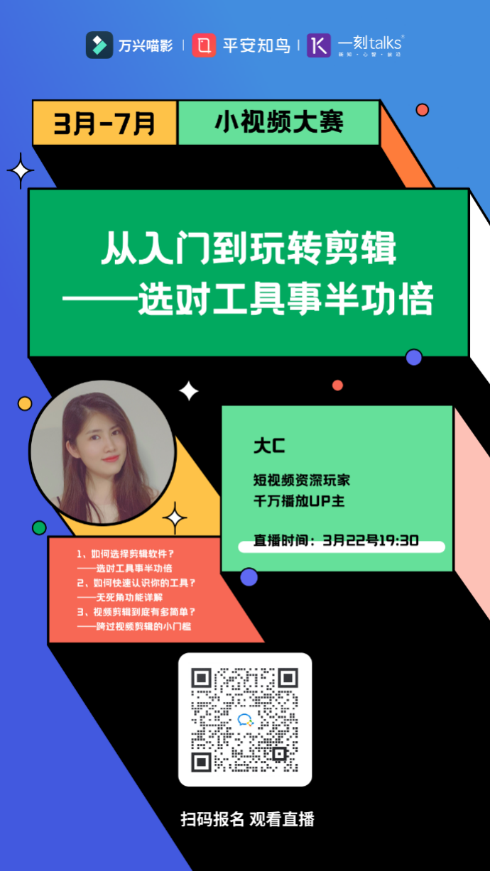 据悉,#一分钟SHOW职场干货#小视频大赛自3月求职季上线,将持续至7月底,为期4个月,大赛包含作品提交至平安知鸟APP、12场线上直播、线上初赛、晋级复赛、线下决赛及颁奖典礼等环节。根据规划,大赛设有专家评审委员会、培训专家团,并设置数十万奖金池,获奖者不仅将有机会瓜分奖金大奖,更有机会成为职场知识网红“C位”出道。万兴喵影作为活动主办方之一,在此次大赛中将提供视频创意软件工具、活动专用视频资源包、千万播放UP主视频制作讲解直播课等资源,全方位赋能选手输出高品质内容。