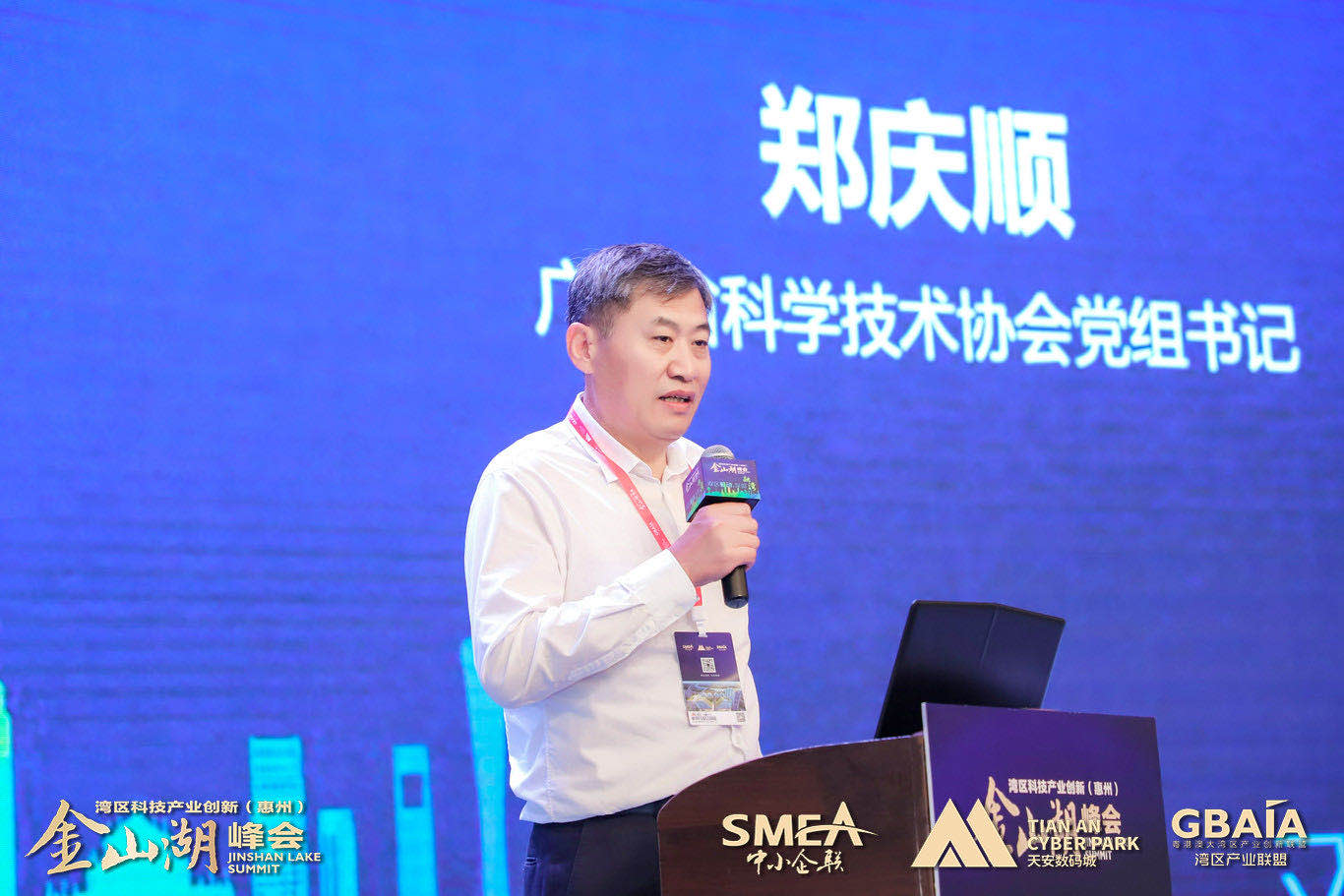 广东省科学技术协会党组书记郑庆顺在致辞中表示“广东省委省政府高度重视并深入推进粤港澳大湾区城市群和深圳都市圈的建设,“十三五”以来,粤港澳大湾区战略全面实施,深圳先行示范区开局良好,广东省一核一带一区建设加快推进,站在新的历史交汇点,如何为“十四五”开好局、起好步,作为经济大省的广东亮出了清晰的坐标。省政府工作报告,特别是广东省“十四五”发展规划明确深圳都市圈范围,提出了举全省之力推进粤港澳大湾区和深圳先行示范区建设,充分激发双区建设协同和战略效应、辐射引领效应。广东省委省政府提出在创新和高质量发展方面,继续强化战略科技力量,加强基础研究、技术攻关和创新建设,特别是提高自主创新能力。今天我们在这里召开首届湾区科技产业创新金山湖峰会,我相信科技人才、组织资源在这里汇聚,必将为科技创新注入新的动能。在此我希望广大科技工作者以高度的历史责任感和使命感,坚持四个面向,紧抓双区建设时代机遇,与时俱进,团结创新,团结带领广大科技工作者锐意进取,扎实工作,通过深莞惠科技协作与创新服务合作平台,引导学会、企业、高校、科研院所等单体性零星化的创新机构有机联动,创新资源及系统集成,加强产业链的技术、成果、人才、资金的优化整合,着力提升科技成果转化能力,携手打造助力大湾区国际科技创新建设的合作典范,为推动全省经济高质量发展贡献科协应用的力量。”