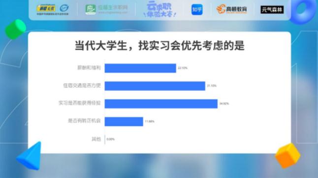 大家在寻找实习的过程中,会优先考虑的三个因素分别是实习是否能获得经验、住宿交通是否方便、薪酬和福利。