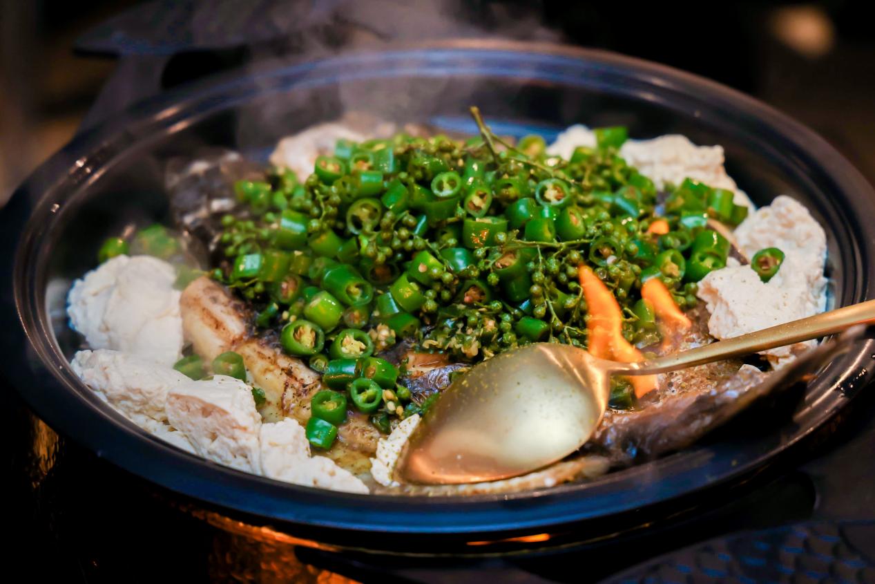 除了视觉感官外,探鱼全新lab店的产品完全颠覆了探鱼以往的产品结构和产品体验,所有的产品都以“极致释放”为准则,凉菜更冰爽,热菜更火热,更高的颜值、味道更加的让人印象深刻,有好玩、惊喜的感觉。探鱼的经典产品“鲜青椒烤鱼”也在lab店有口味上和形式上的升级,味道上加重了核心的“爽麻”的口感,上菜形式也增加了添酒增香、点火炙烤等充满仪式感的内容。提高菜品品质的同时,也使顾客拥有了更别致的用餐体验。