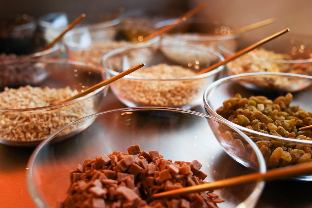除了产品口味、形式上的革新,探鱼的lab店还新增了“DIY”专区。茶水、水果、凉菜、冰粉都可以在DIY区根据自己的口味随意搭配,增加了消费者在用餐过程中的可玩性。值得一提的是,探鱼的DIY冰粉取消了目前市场中常见的或固定或多样的搭配方式,为消费者提供了3种冰粉基底,18种各色配料,搭配方式和用量全部由消费者自己选择。不同口味质地的配料为消费者提供了至少17000+种配比方式,这样的设置潜在性地增加了用餐的社交功能,在整个就餐过程中,消费者被拥有了“体验者”与“传播者”的功能性身份,拥有了一场“就餐+游戏”的个性体验。