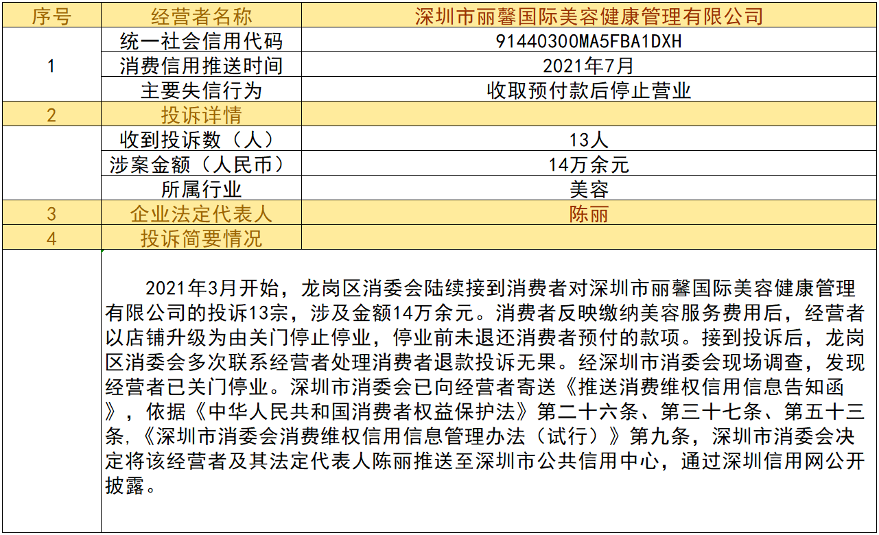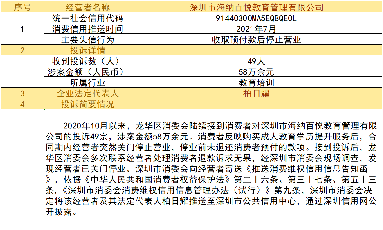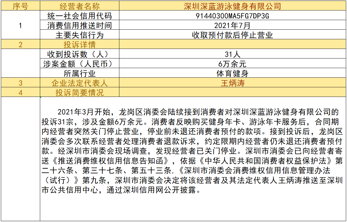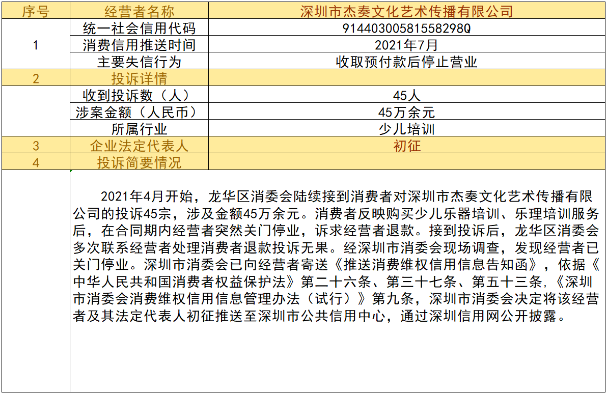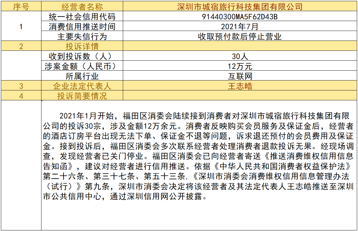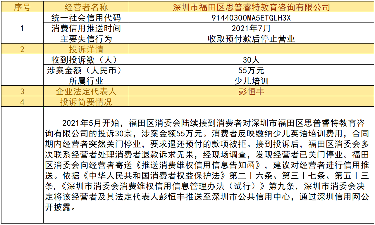 近日,深圳市消委会将九家“跑路”、未按约定退还消费者预付款项的经营者及其主要负责人推送至深圳市公共信用中心,失信经营者信息信息将通过深圳信用网公开披露。