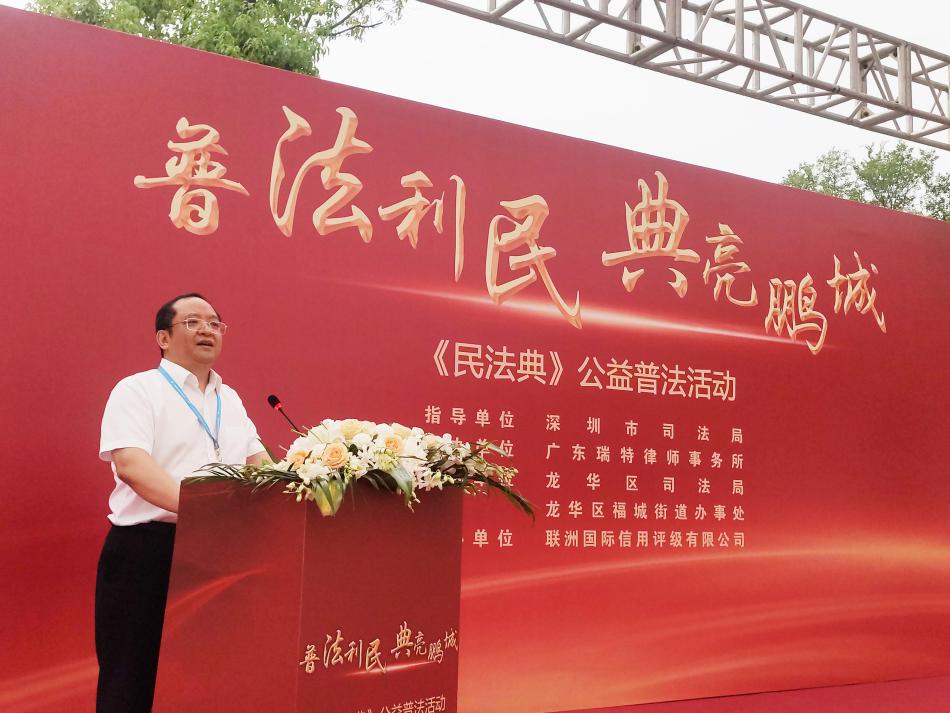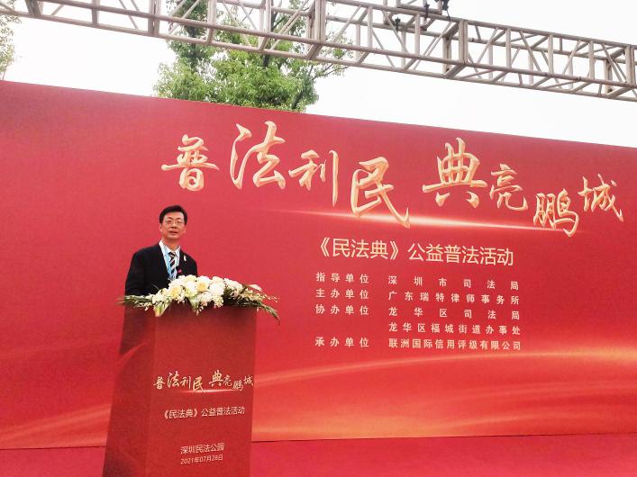 读特客户端·深圳新闻网2021年7月29日讯 (记者 常军平) 昨日,由深圳市司法局指导、广东瑞特律师事务所主办、龙华区司法局、龙华区福城街道办事处、深圳潮青会协办、联洲国际信用评级有限公司承办的“普法利民,典亮鹏城”《民法典》公益普法活动在龙华举行。