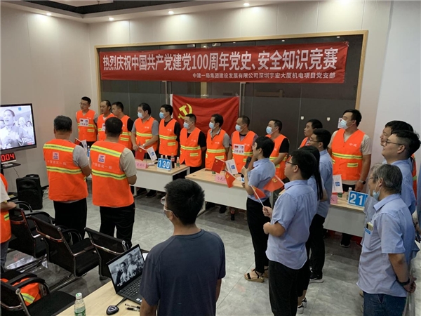 读特客户端·深圳新闻网2021年7月30日讯 同心筑梦,百年芳华,为扎实推进党史学习教育走深走实,创新党史知识学习方法,浓厚学习氛围,增强学习兴趣,近日,中建一局集团建设发展有限公司深圳宇宏大厦机电项目党支部举办以庆祝中国共产党建党100周年“学党史、守初心、保安全、促发展”为主题的党史、安全知识竞赛。此次活动参赛代表队是由项目广大工友组成“忠党队”、“爱国队”、“为民队”、“筑梦队”,共计50余人参加了本次活动。