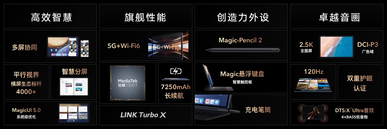 手机新品之外,荣耀全新旗舰平板荣耀平板V7 Pro也惊艳亮相。全球首发联发科迅鲲1300T旗舰级平板定制芯片,采用11英寸2.5K护眼全面屏,支持120Hz高刷新率,搭载为平板进行深度优化的全新Magic UI5.0,平行视界适配4000+主流应用横屏显示。全新荣耀平板V7 Pro不仅拥有着出众的配置,同时还具备四大旗舰产品力:高效的智慧化能力、旗舰性能与通讯能力、富有创造力的配件、卓越的音画体验,将重新定义安卓平板的旗舰标准。