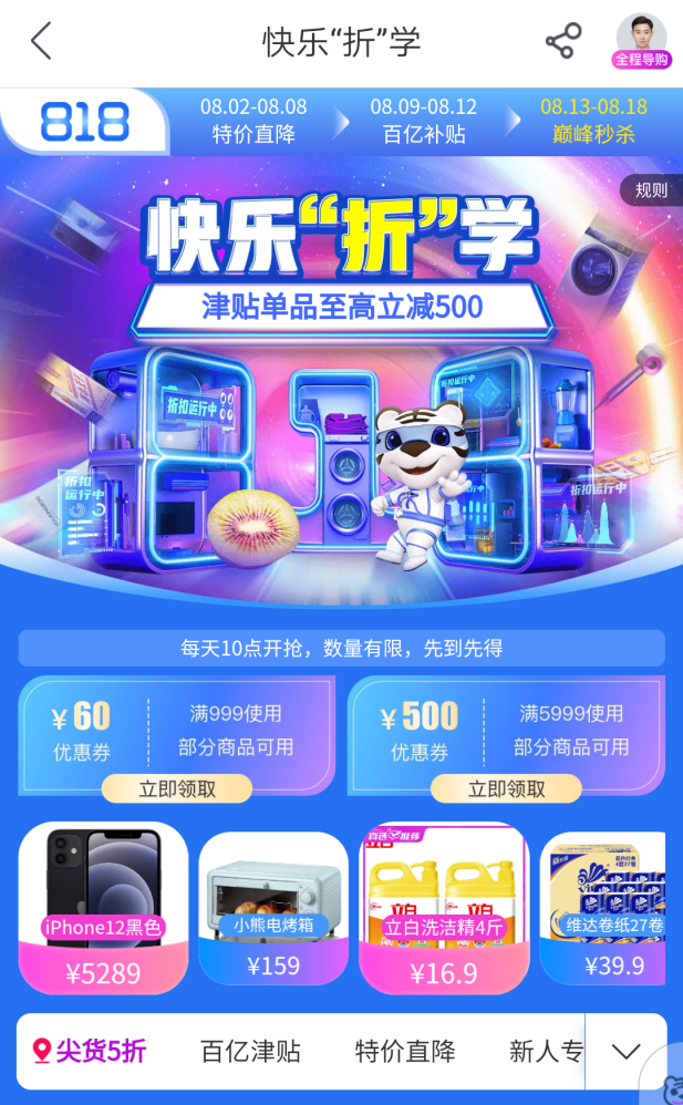 以818大促为例,8月12日至18日期间,“真快乐”以“特价直降”“百亿津贴”和“巅峰秒杀”三重活动让利消费者,一重更比一重优惠。活动福利覆盖食品酒水、服饰鞋包、家居家装、日用百货、母婴玩具、美妆个护、家用电器等全品类品质好物。与此同时,消费者不仅可以享受“真快乐”提供的折扣优惠,还可以通过国美“折上折A PP”领券,再次享受优惠,实现折上再折,折上再减。无需费心拼单、凑单,一键领取优惠券,折扣即可到手。